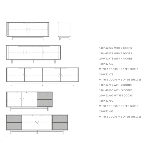 Het meubel is verkrijgbaar in verschillende afmetingen en houtsoorten. Daarnaast kan je kiezen tussen shuiven of deuren voor elk compartiment. Informeer ernaar in onze showroom.